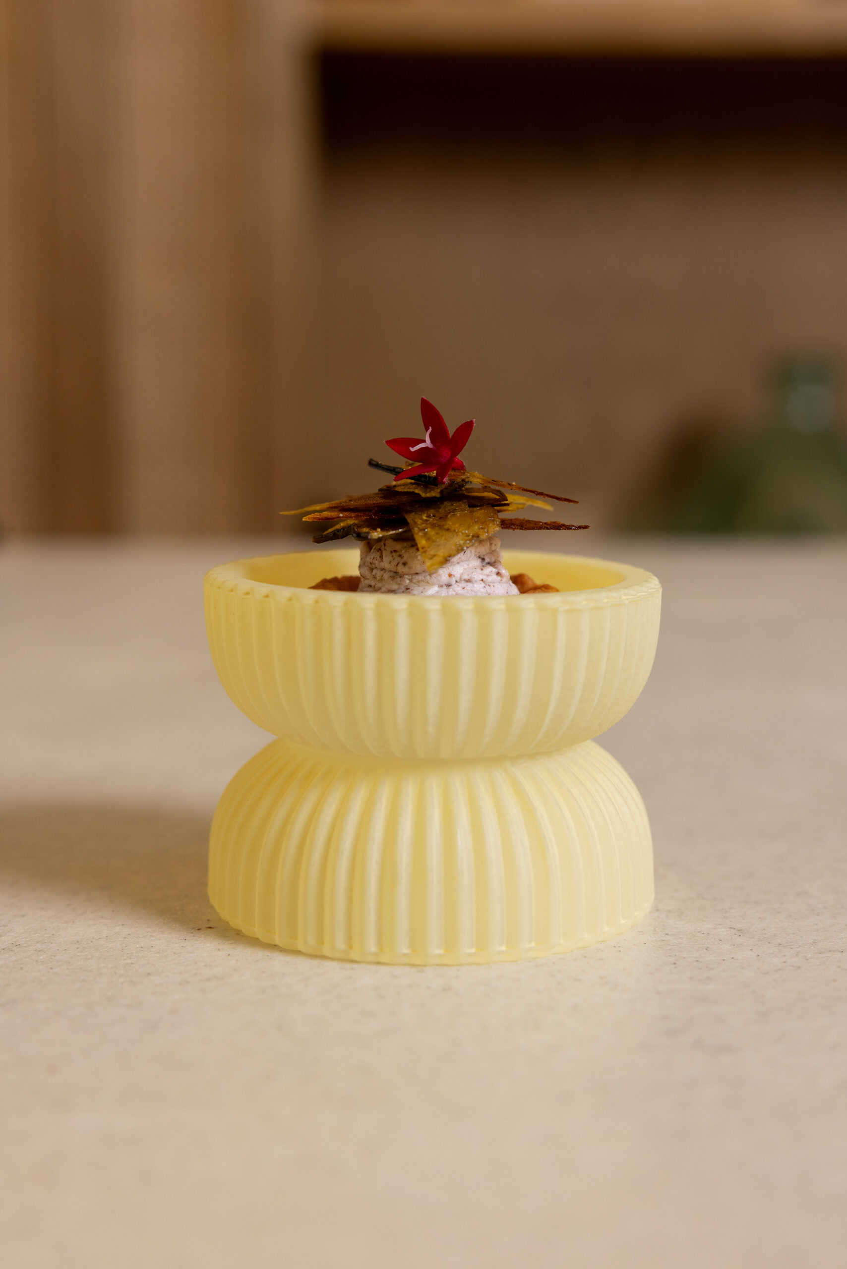 Tartlet of roasted aubergine petals, creamy feta, sumac and scattered blossoms — sun- drenched and sensually spiced.