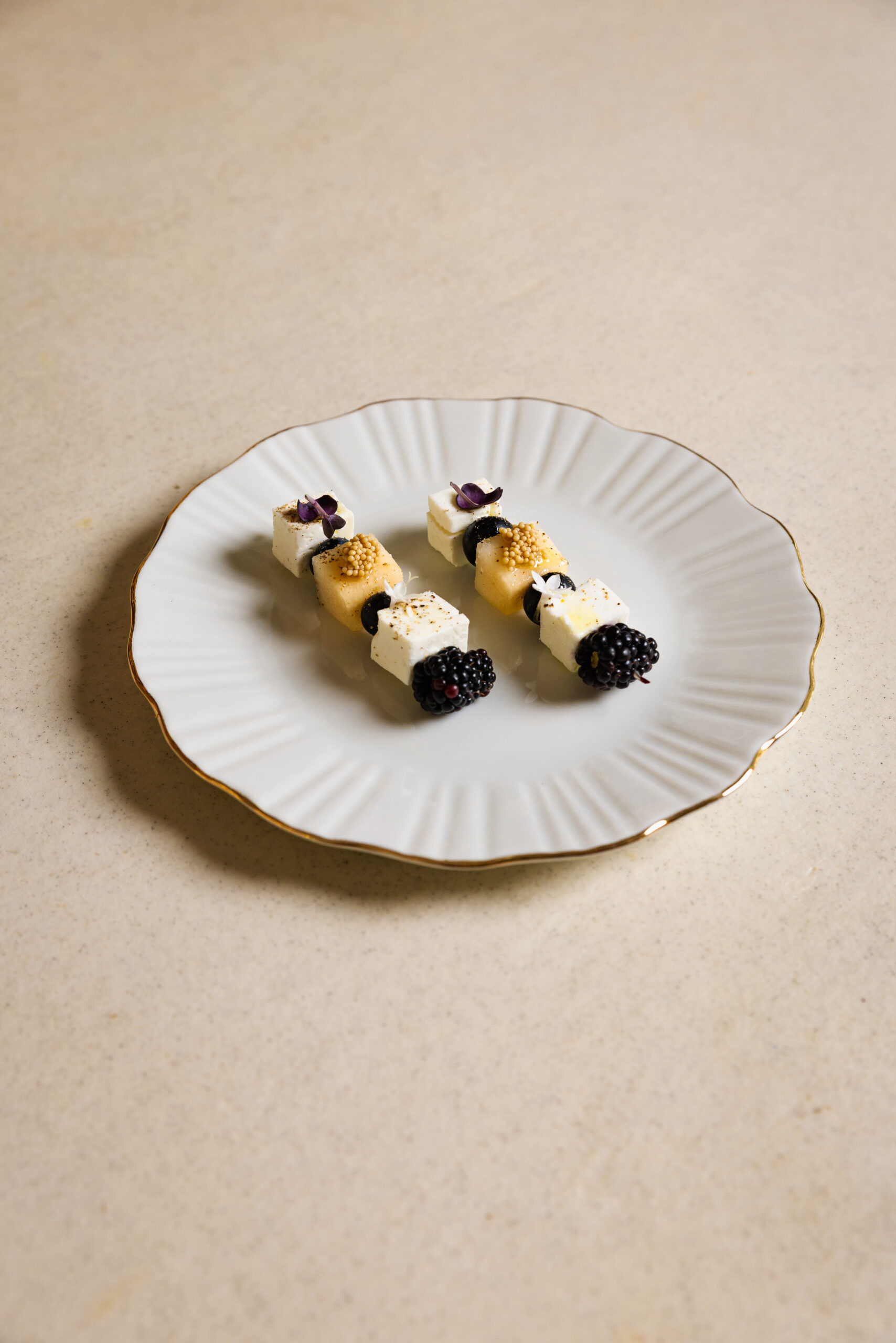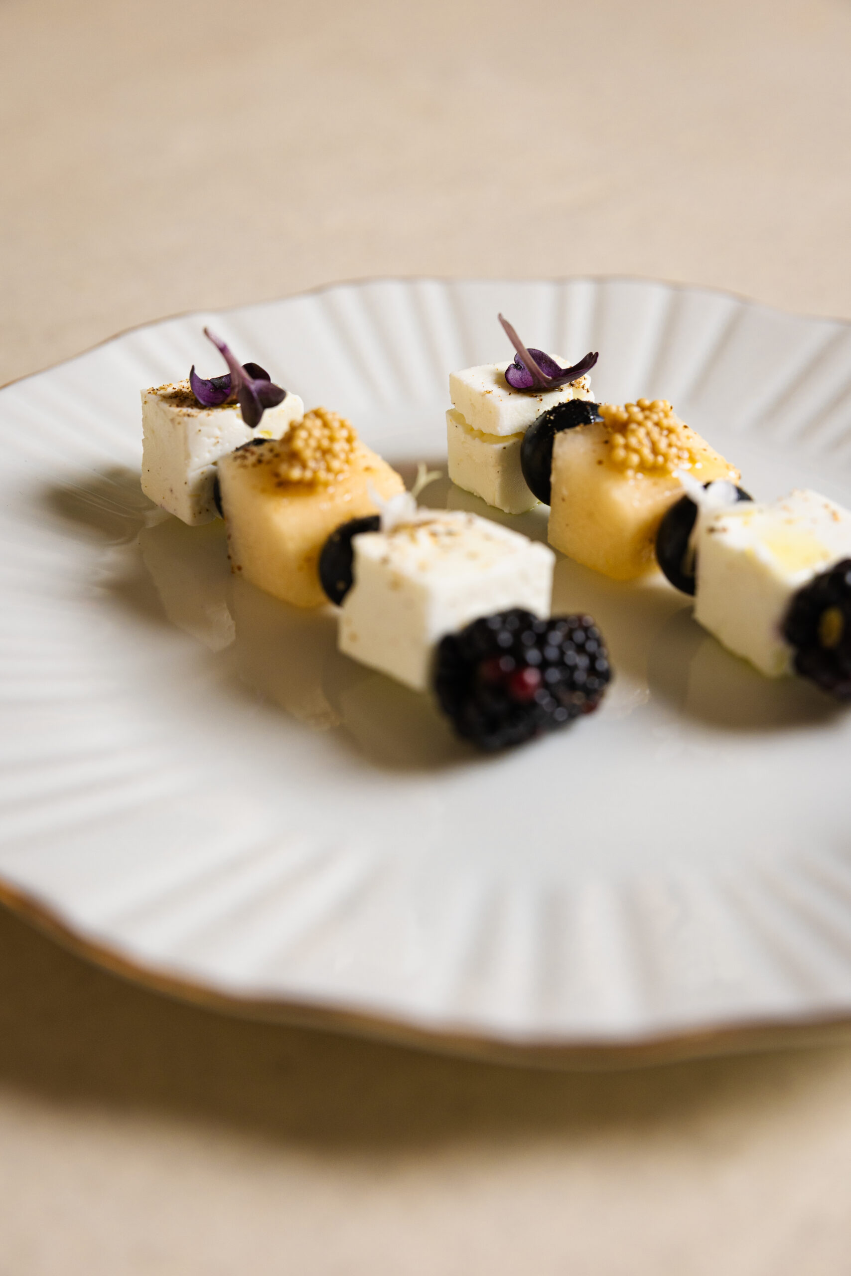 An elegant silver skewer featuring feta, melon, pear, blackberry, blueberry, and pickled mustard seeds a refined bite served with its silver touch.