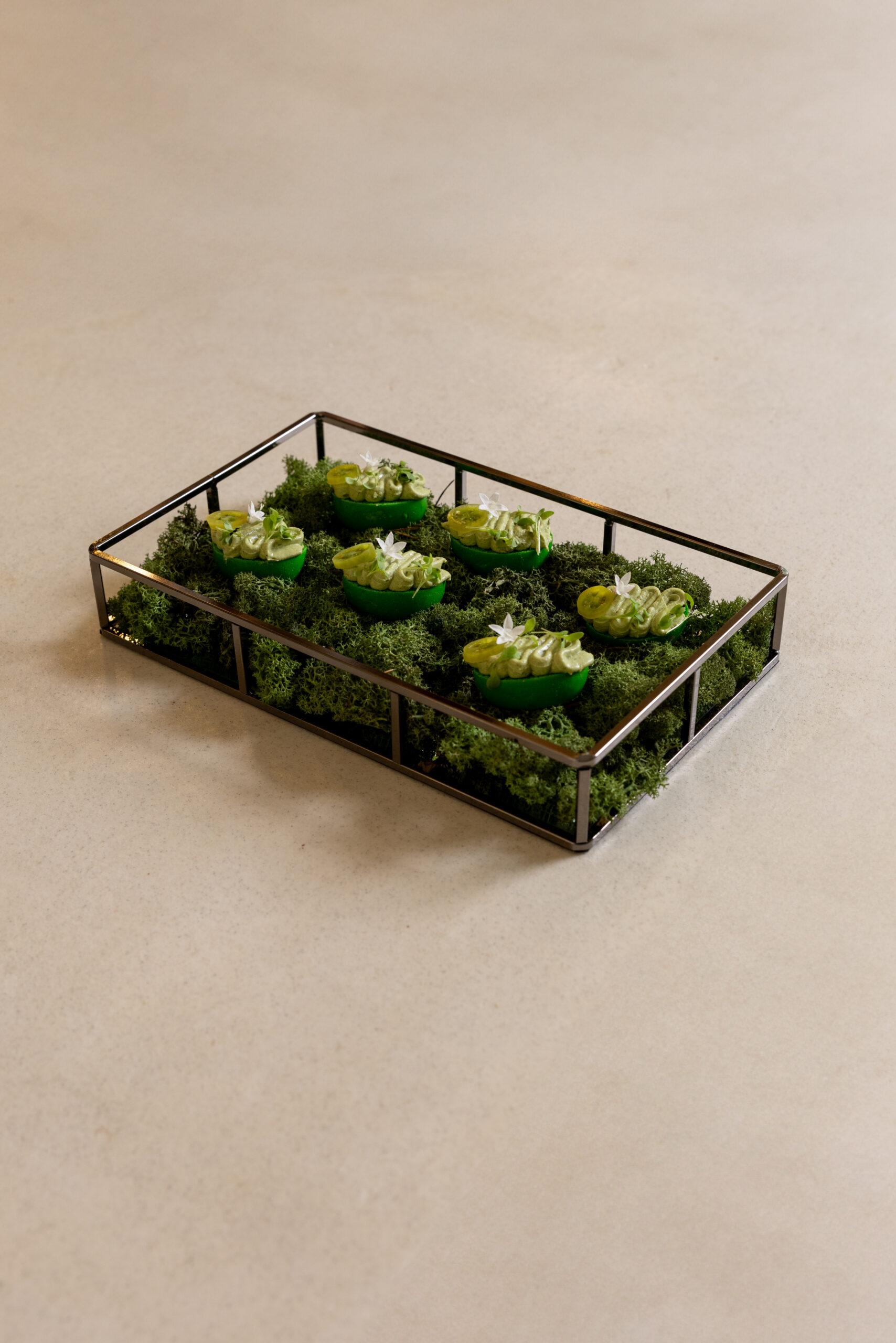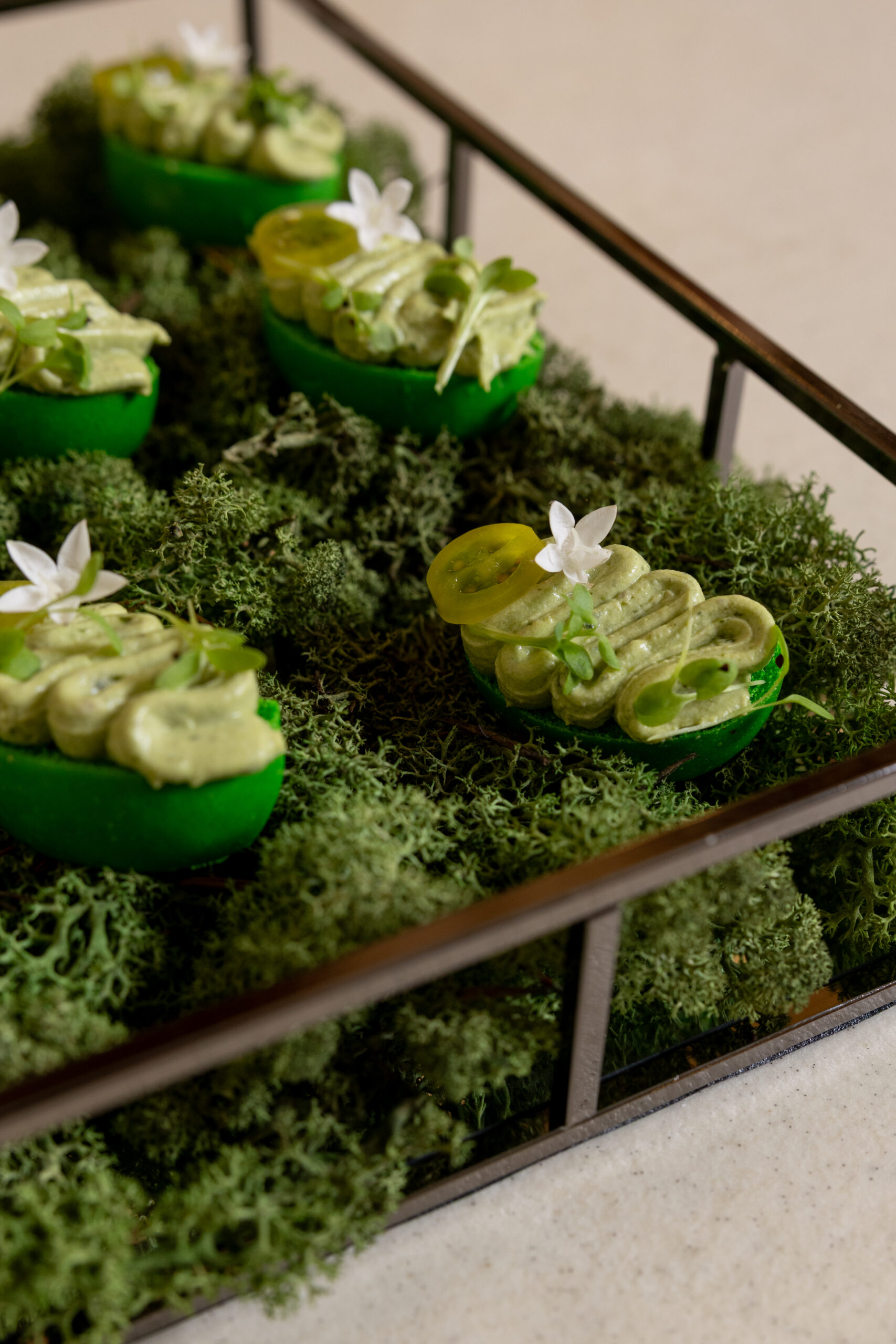Green pesto hummus, slow-roasted green tomato and a white edible flower — a walk through a Mediterranean garden.