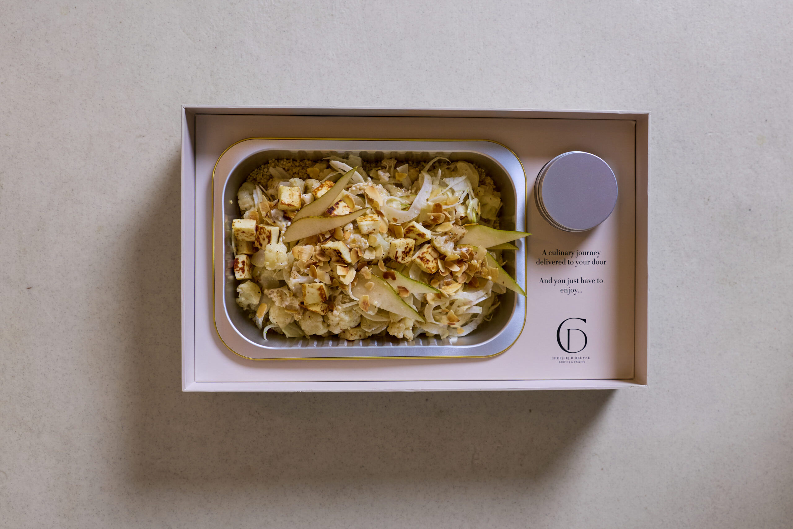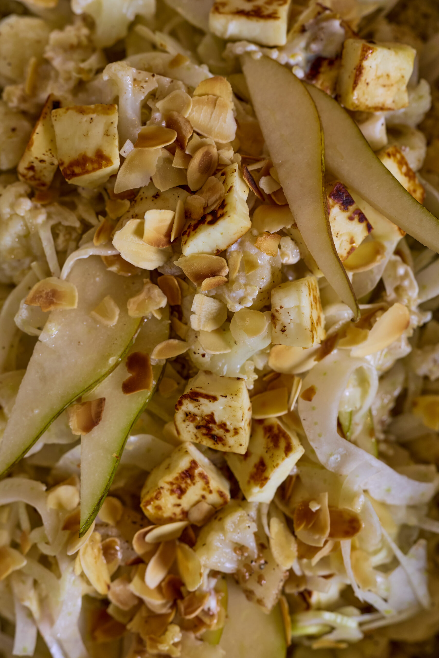 A refined white-toned salad combining creamy Greek yogurt with yuzu zest, roasted cauliflower, quinoa, fennel, pear, and toasted almonds.