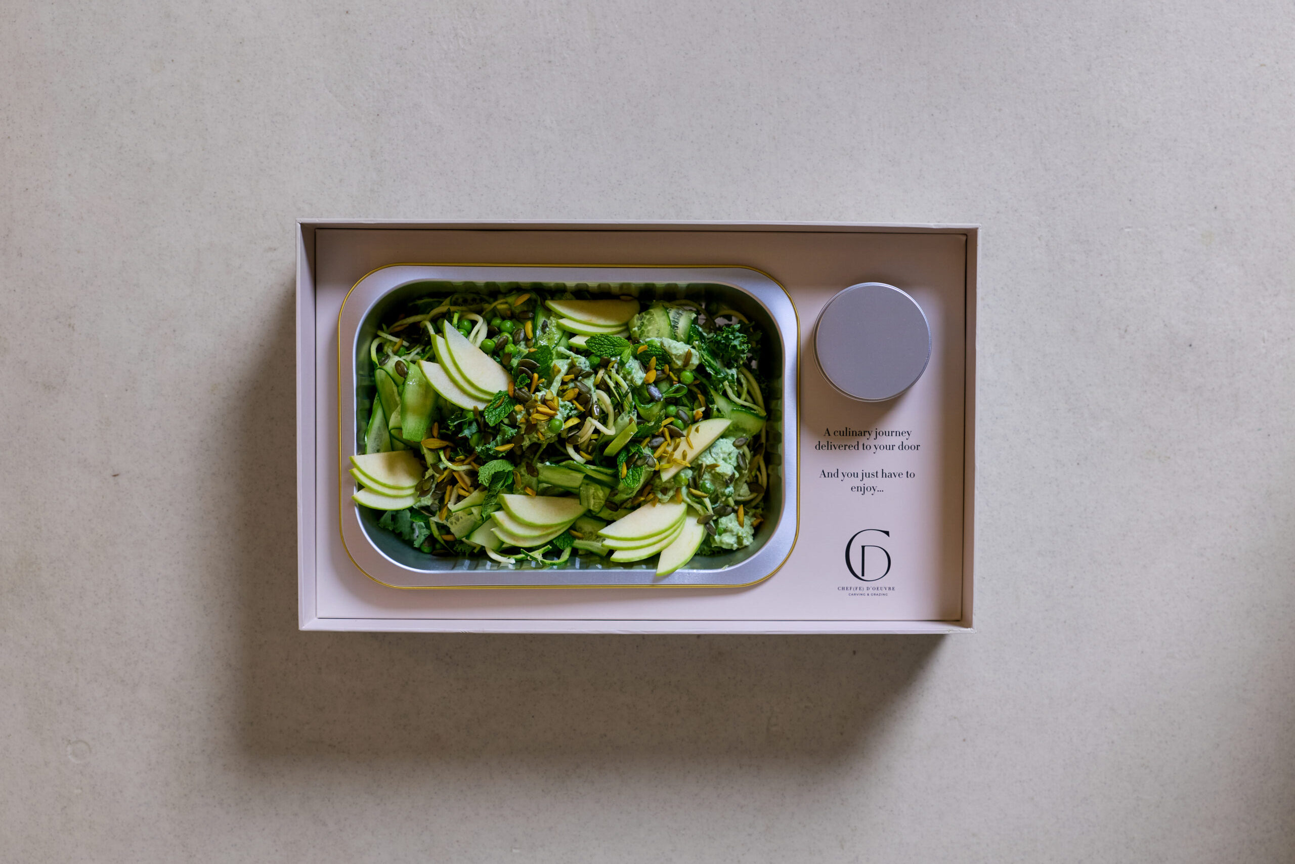 A vibrant green salad with pea & feta cream, kale, fresh cucumber, green apple, sweet peas, pumpkin seeds, and fresh mint.