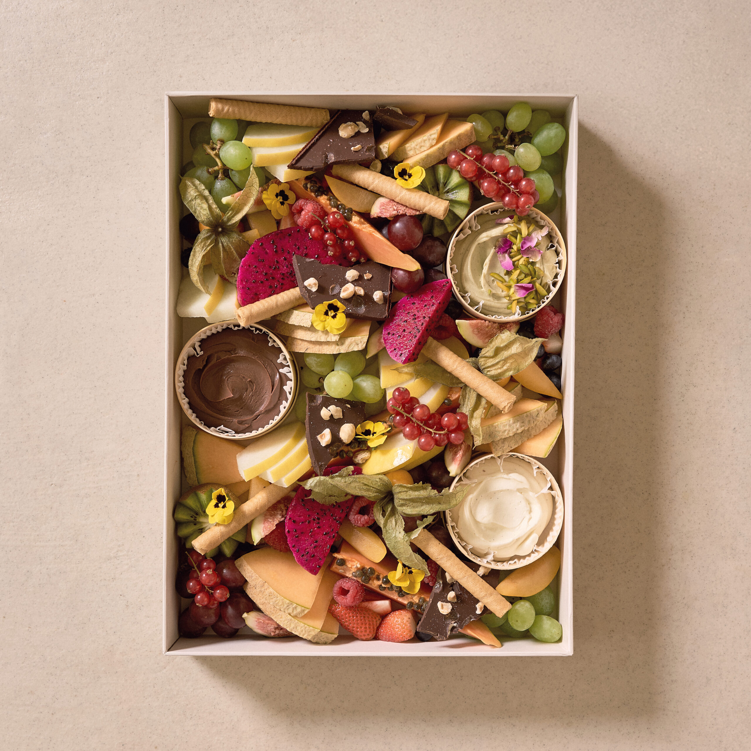 4. Assortment of seasonal fruits: strawberries, raspberries, pineapple, mango, kiwi, cherry, figs, peaches, blackberries, blueberries, red currant, citrus fruits, kumquat, melon yellow & white
