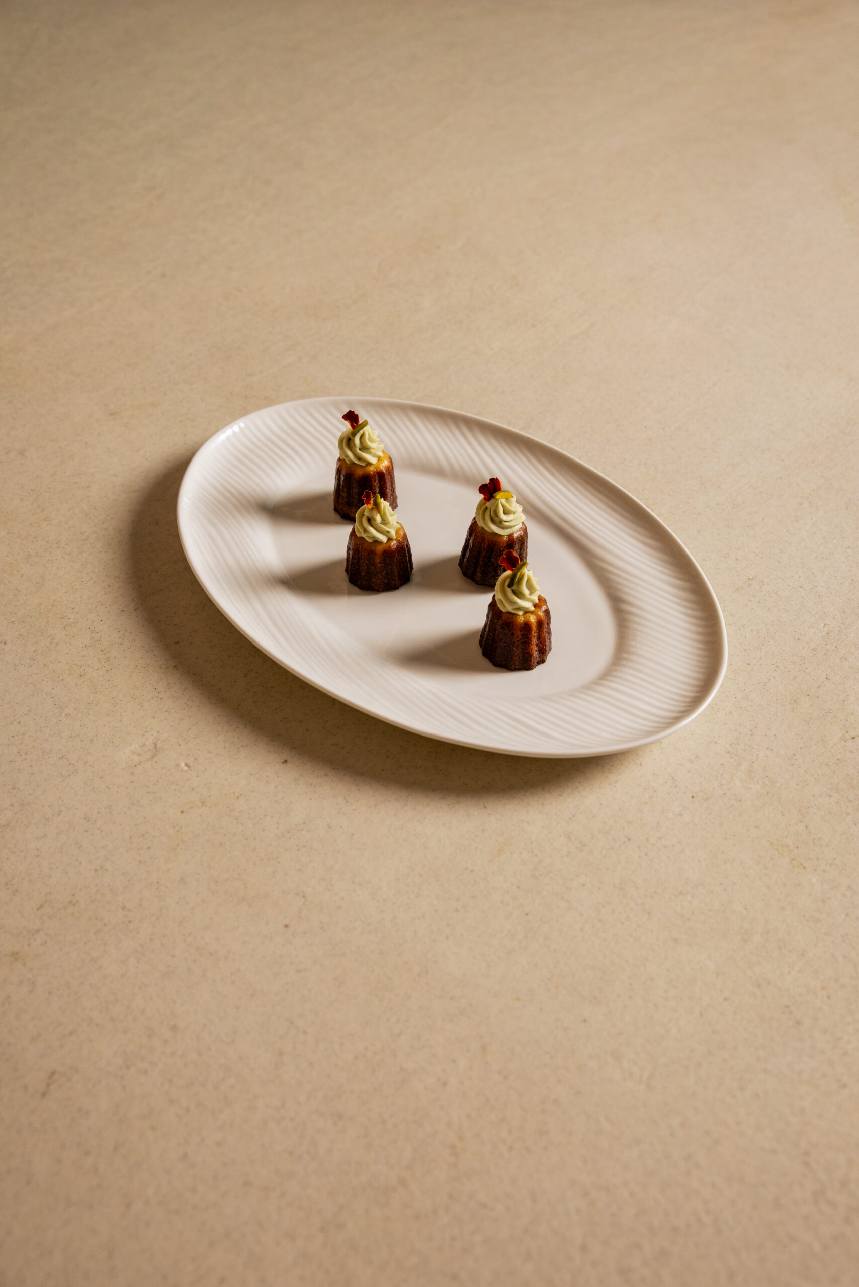 A soft and tender canelé on the inside, with a beautifully caramelised and crisp exterior, filled with a silky matcha and pistachio ganache.