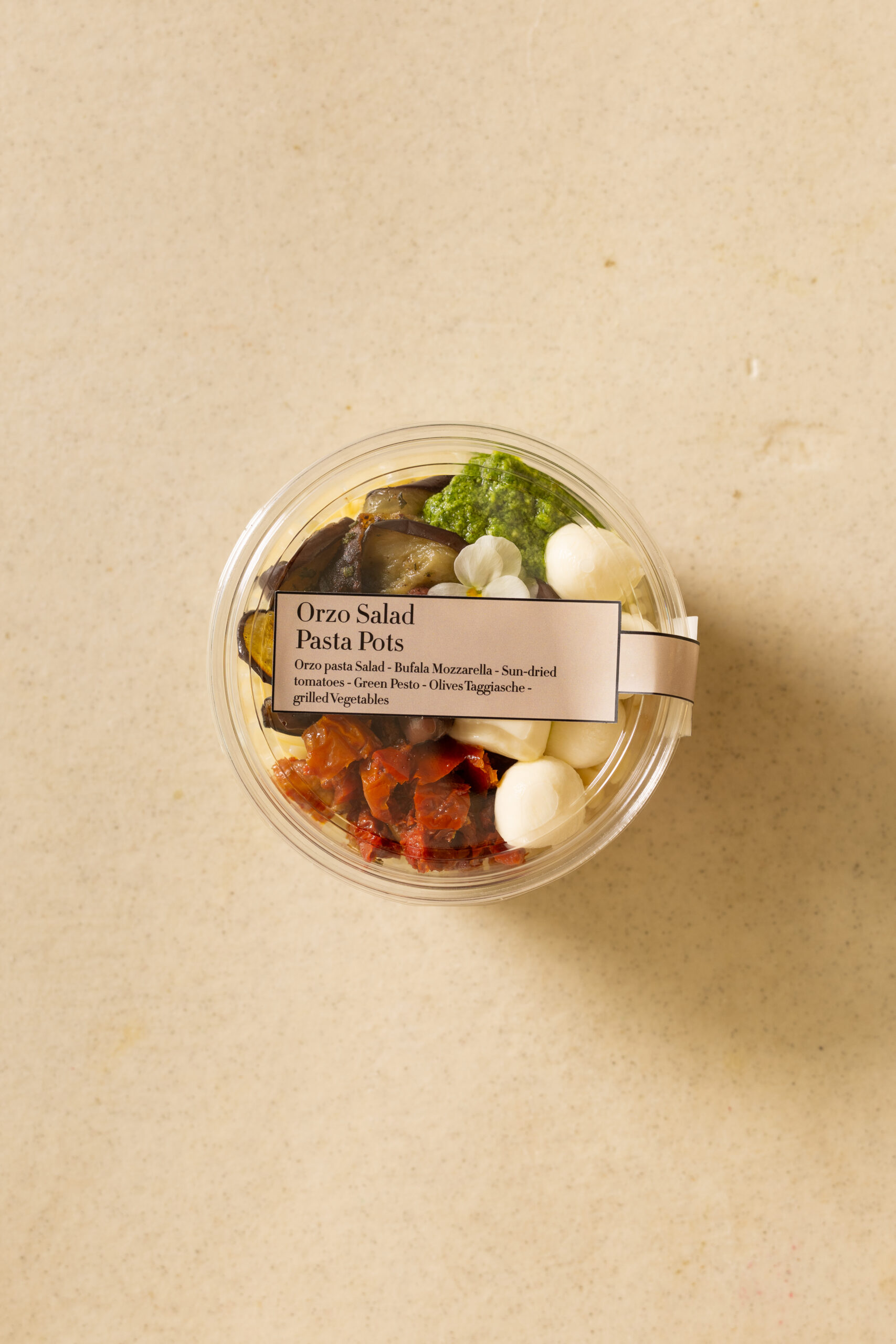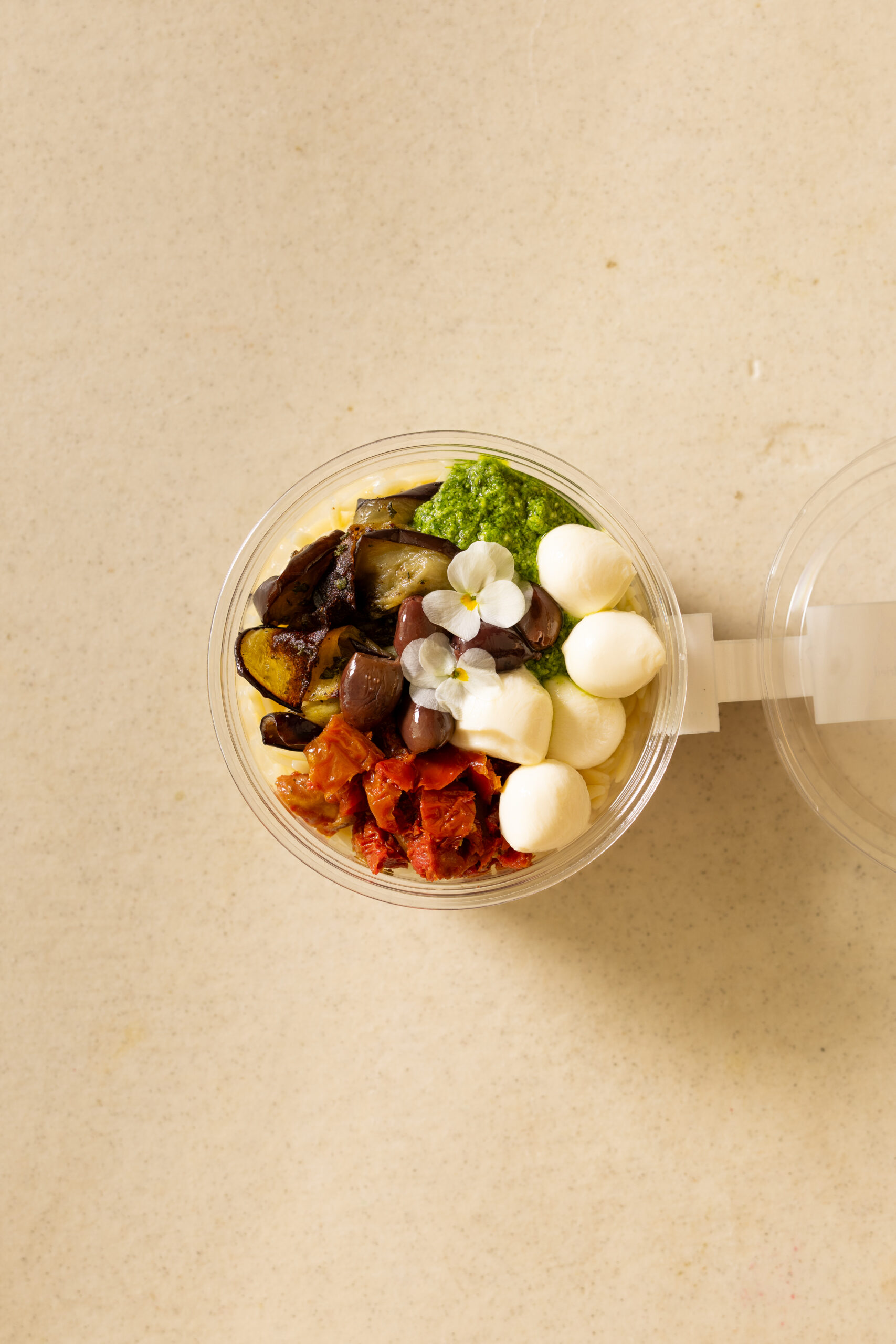 Orzo pasta Salad – Bufala Mozzarella – Sun-dried tomatoes – Green Pesto – Olives Taggiasche – grill Vegetables