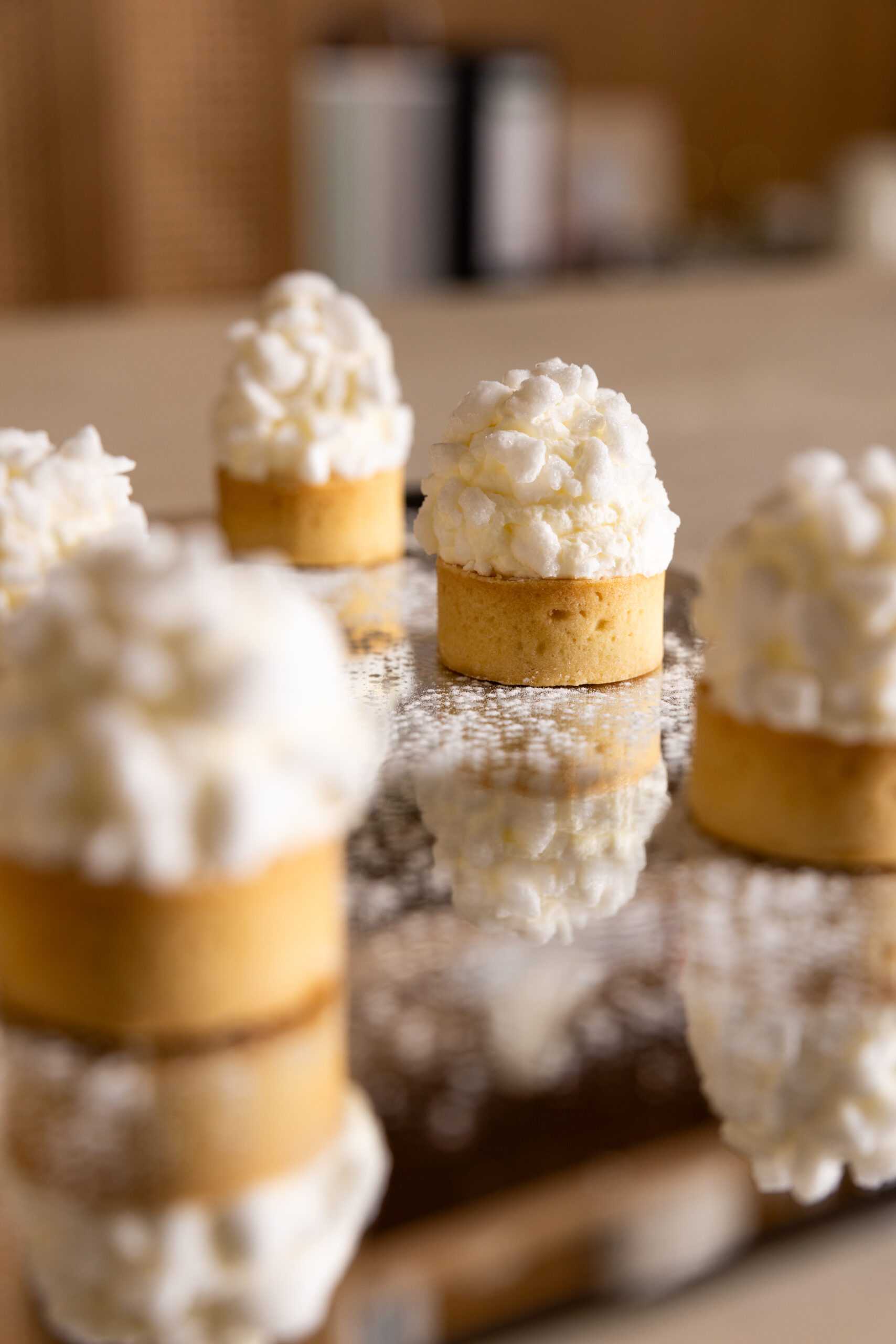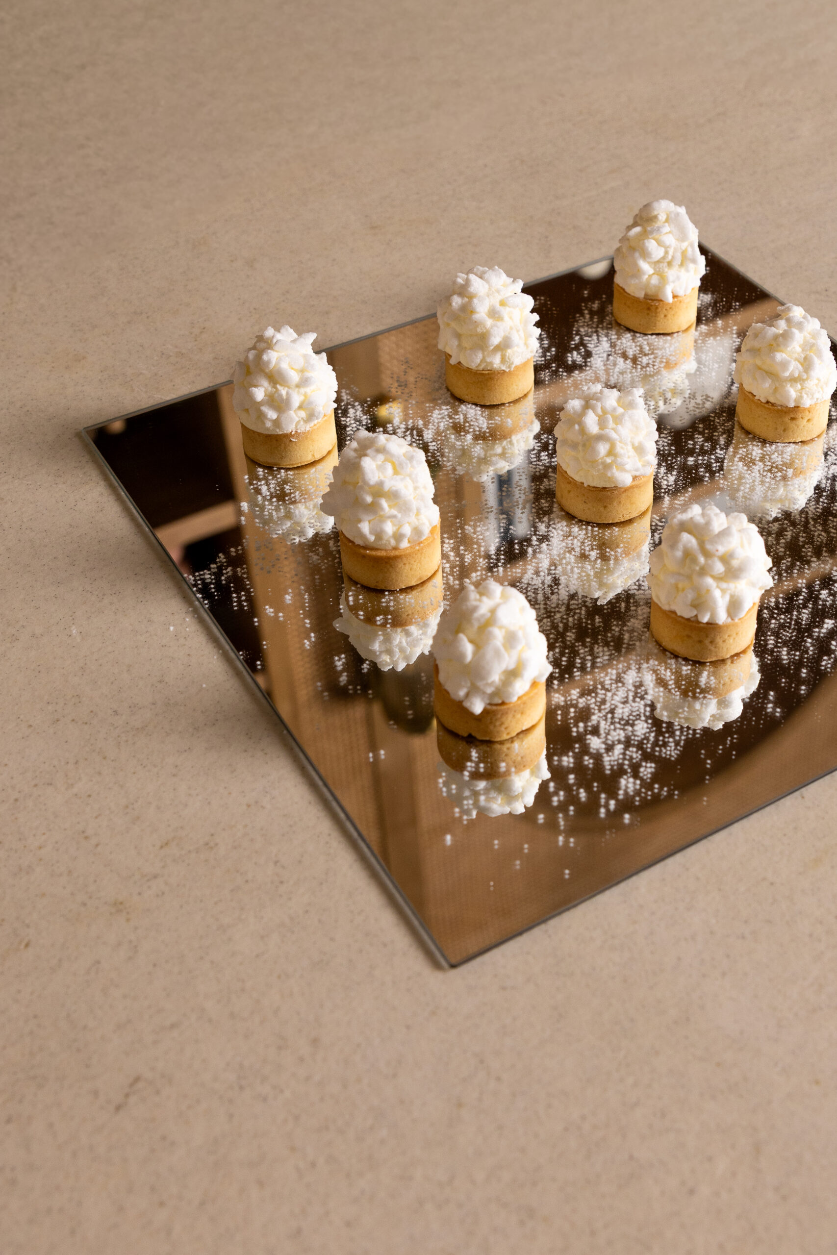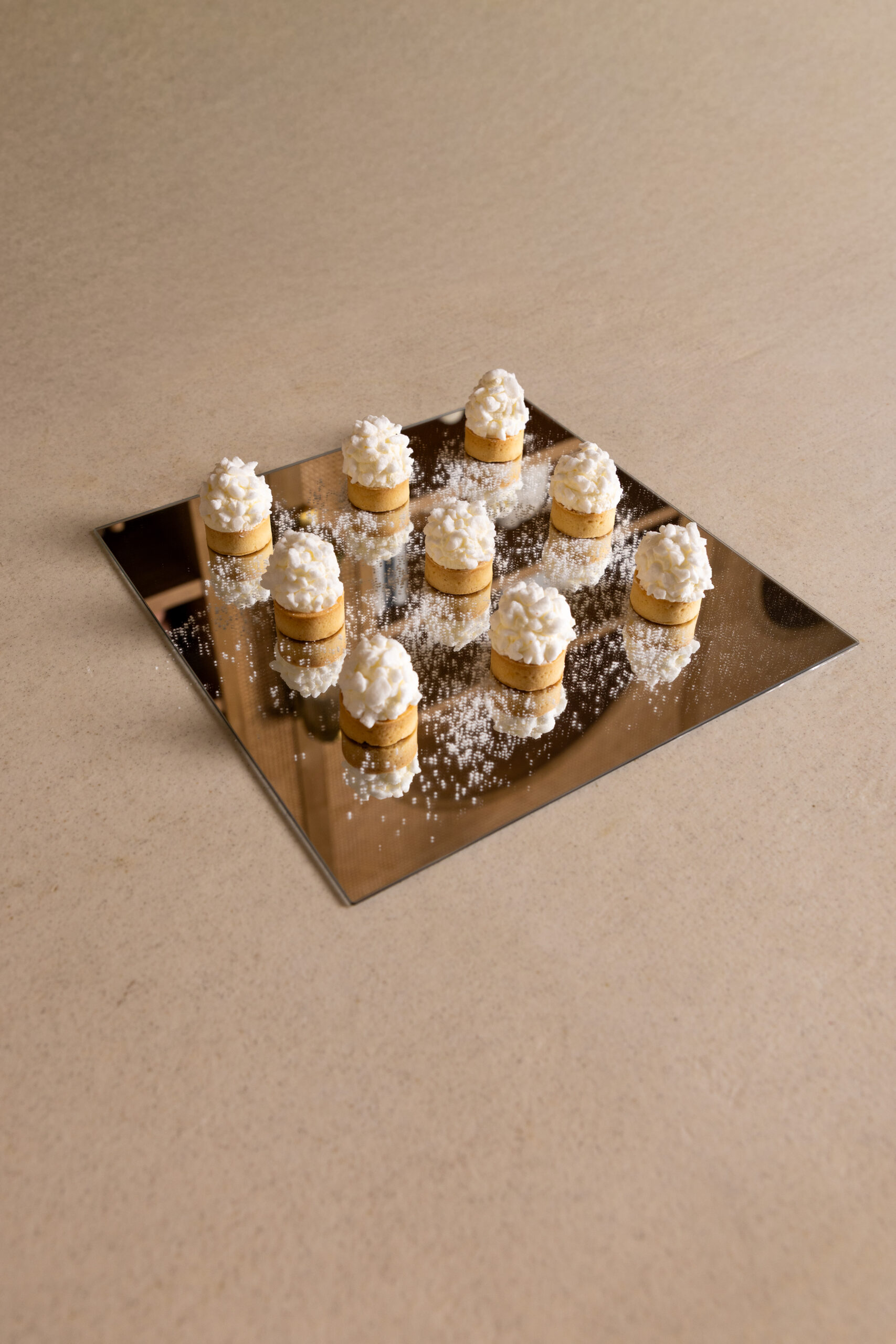 An elegant bite inspired by the purity of Italian snow — a crisp sablé base topped with a delicate vanilla cream cloud & raspberry , embodying refined simplicity and timeless grace.