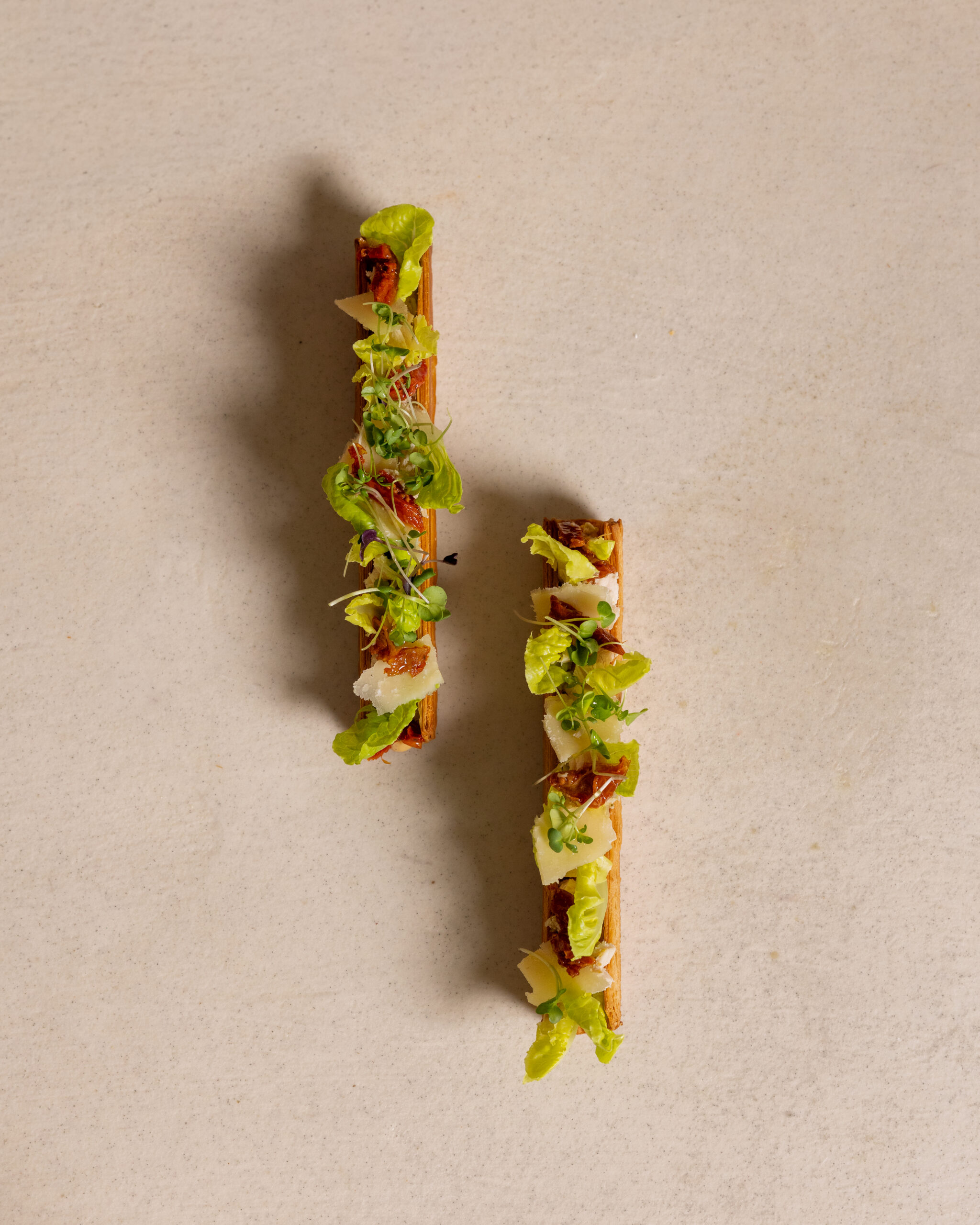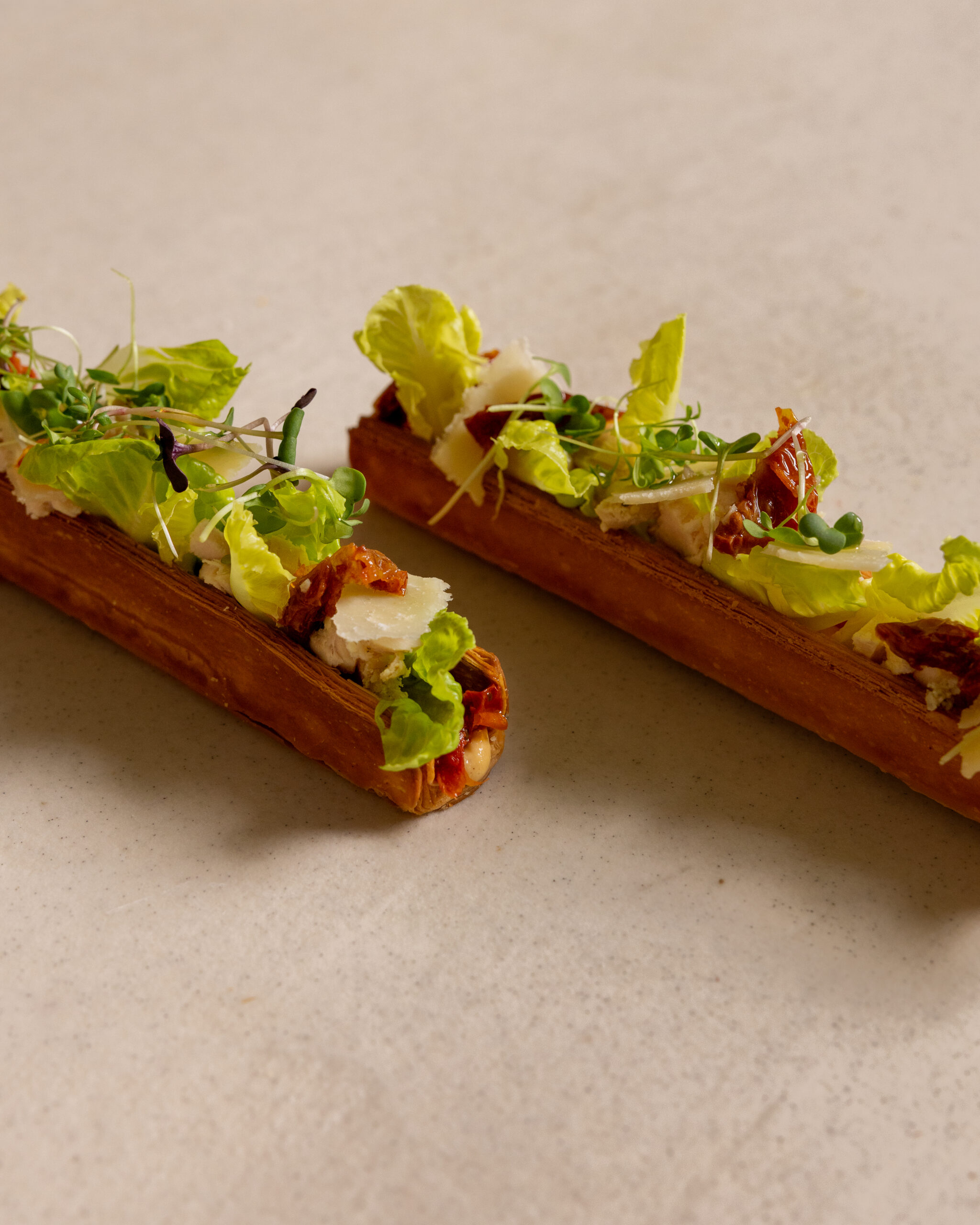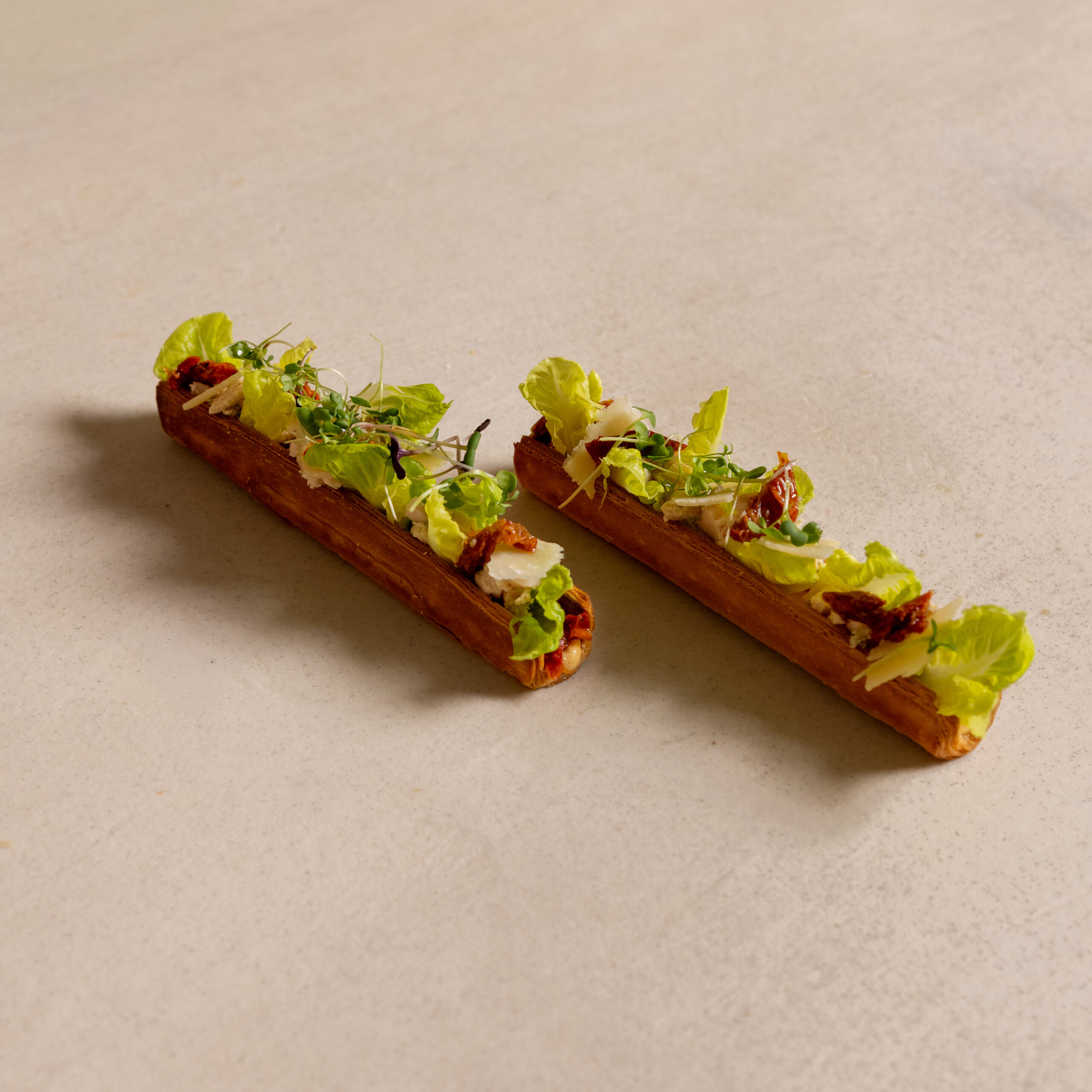 A crisp puff pastry filled with baby gem lettuce, tender chicken breast, sun-dried tomato, shaved Parmesan, anchovies, and our signature thick homemade Caesar cream.